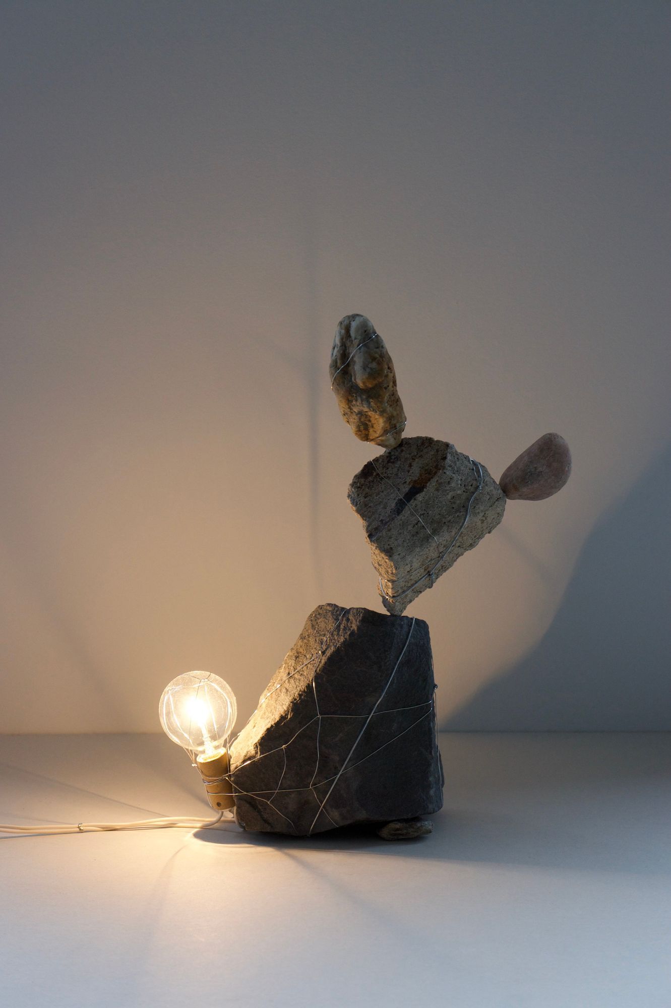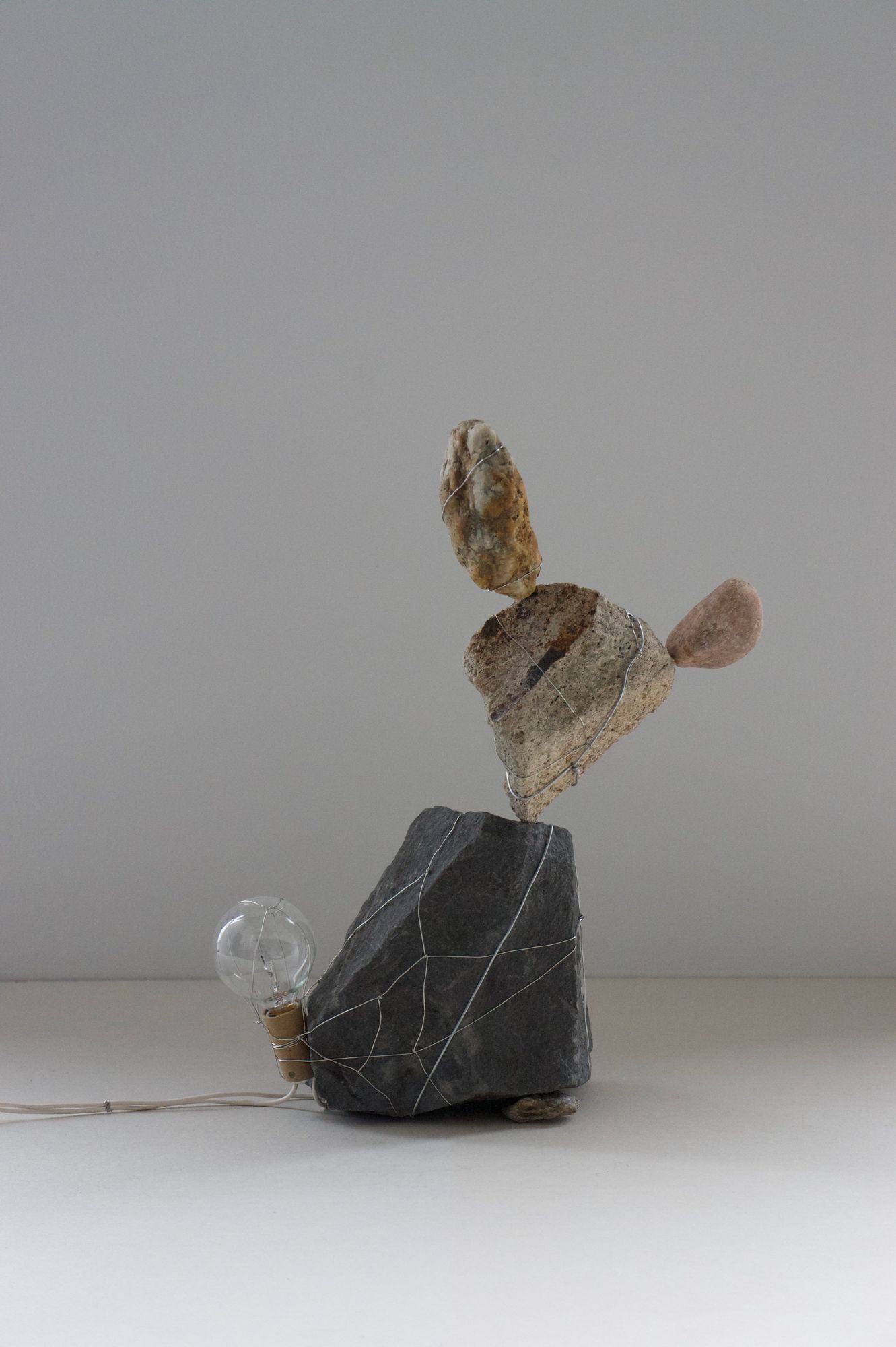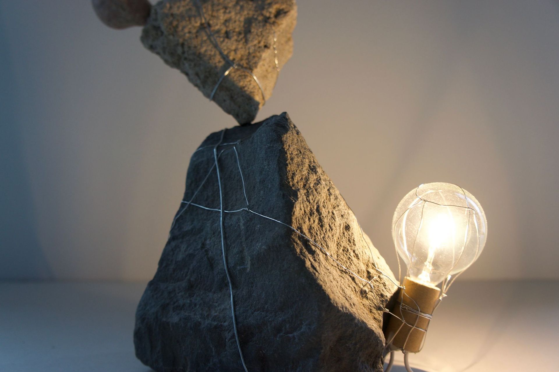 rocks, incandescent light bulb, stainless steel wire, electrical wire, hardware